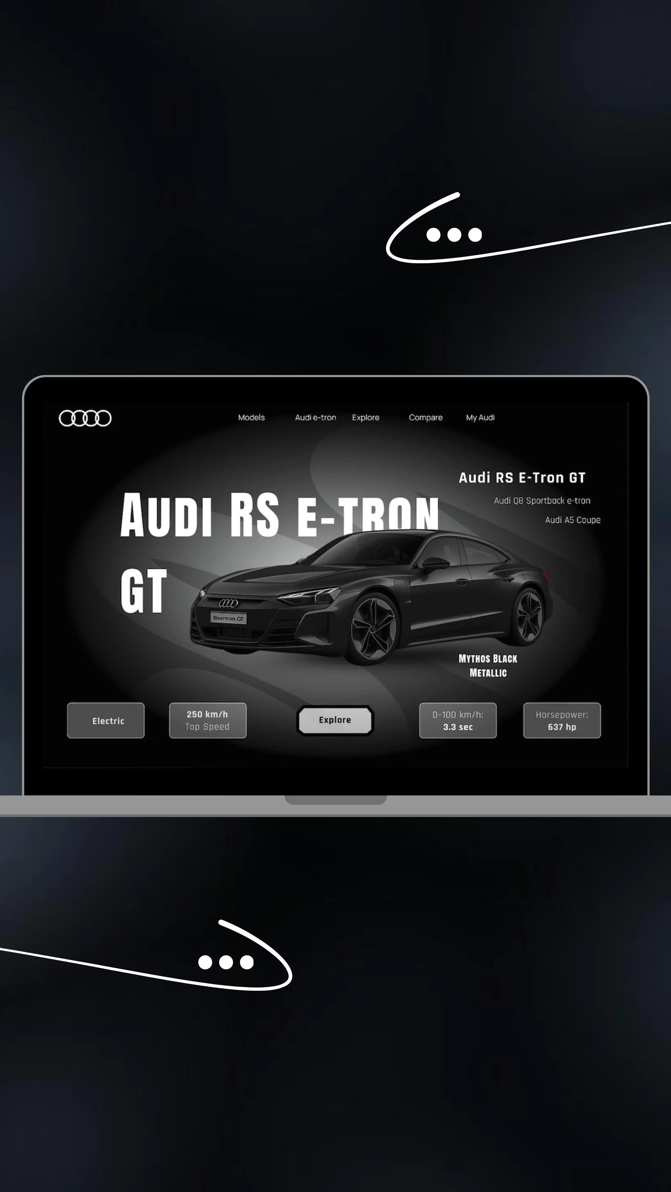 This project is a dynamic car showcase built in Figma, featuring three Audi models: RS e-tron GT, Q8 Sportback e-tron, and A5 Coupe. The user can switch between models by dragging across the screen or clicking the car names in the side menu.